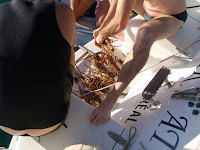 Nous sommes retournées aux petites iles récifs près du bateau, accompagner par les filles, qui commencent à maitriser leurs scubas et palmes. Nous avons changé d’ile avec hier, et nous avons encore pêché des langoustes pour un repas pour 5 personnes. Nous avons pêché environ 4 heures avec la petite baignade de ce matin, je vais devenir en forme. Aujourd’hui, j’ai pris mon part de langoustes et Claude a réussi à casser la glace comme on dit avec sa première langouste. J’ai pris un poisson rouge aux gros yeux, bon à manger, malheureusement j’en ai blessé un que je n’ai pas réussi à récupérer.