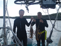 Nous sommes arrivé un peu tard, mais les 2 males voulait de la langouste, un peu de prospection sur le pourtour de notre ancrage, un tour un peu au large, rien à faire dans le coin ou nous sommes il y a beaucoup de courant. En se rapprochant de notre ancrage, au lieu de prendre des têtes de corail nous avons pêché le long de l’ile, résultat une langouste, j’ai manqué la deuxième.